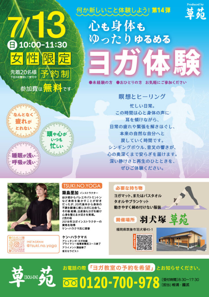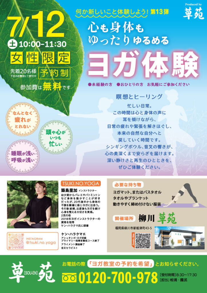 【柳川草苑】【羽犬塚草苑】ヨガ体験のご案内